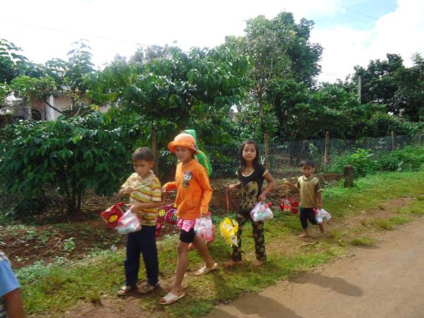 Đoàn đã trao 35 phần quà gồm: gạo, mì gói, nước tương, cặp sách, áo quần, lồng đèn, bánh trung thu, nước ngọt… giá trị 400 ngàn/ phần cho bà con bệnh phong xã Đắk Ru. Và hơn 1000 phần quà trung thu cho các trường xã nói trên. Mỗi phần trị giá gần 100 ngàn đồng.