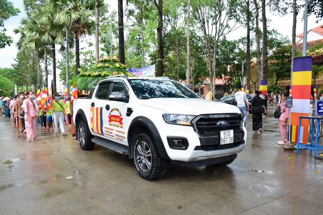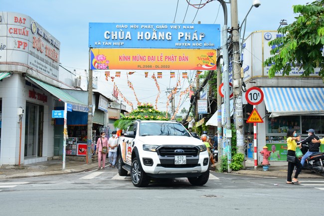 Sau đó, quý Thầy đã niêm hương bạch Phật, thực hiện nghi thức Phật an tọa, cung nghinh tôn tượng Phật đản sinh lên xe hoa, trở về chùa Hoằng Pháp và được tôn trí tại Giảng đường chính.