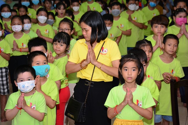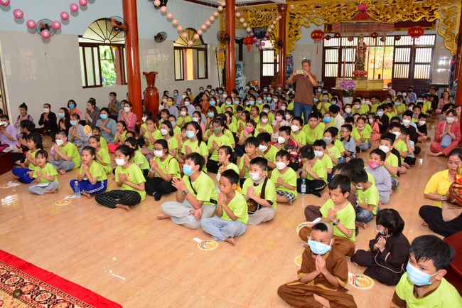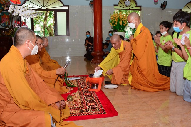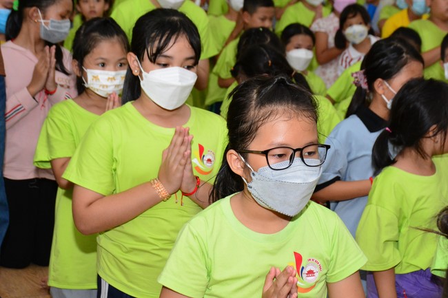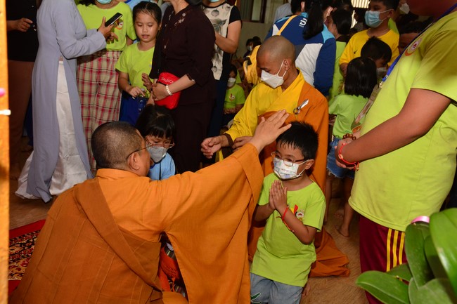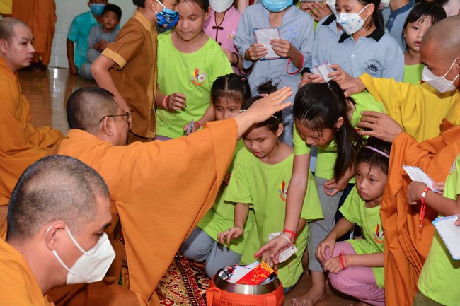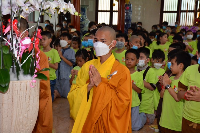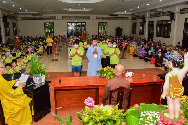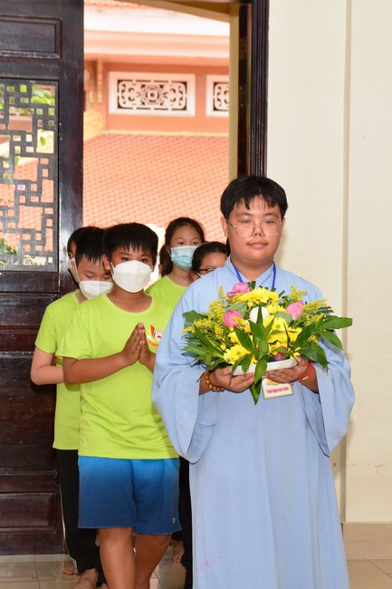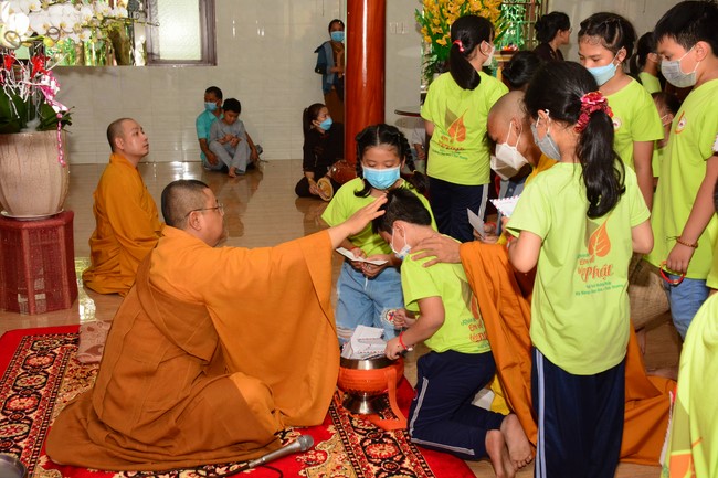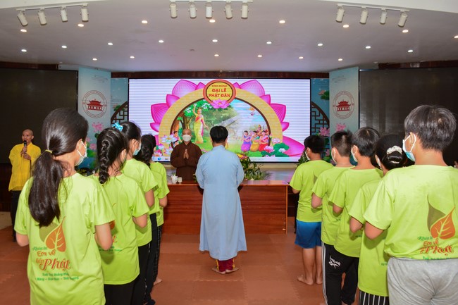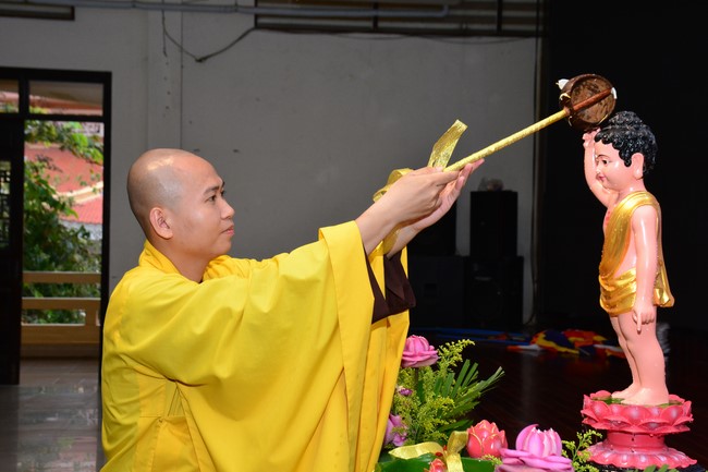 Sau đó, đại chúng cử hành nghi thức tắm Phật truyền thống. Đây là dịp nhắc các em về cội nguồn, ý nghĩa ngày Khánh đản của đức Tôn sư. Nhằm gieo duyên lành, gieo vào tâm thức của các em về hạnh nguyện tốt đẹp của Ngài, để các em noi theo học tập.
