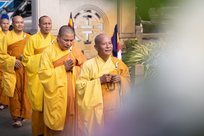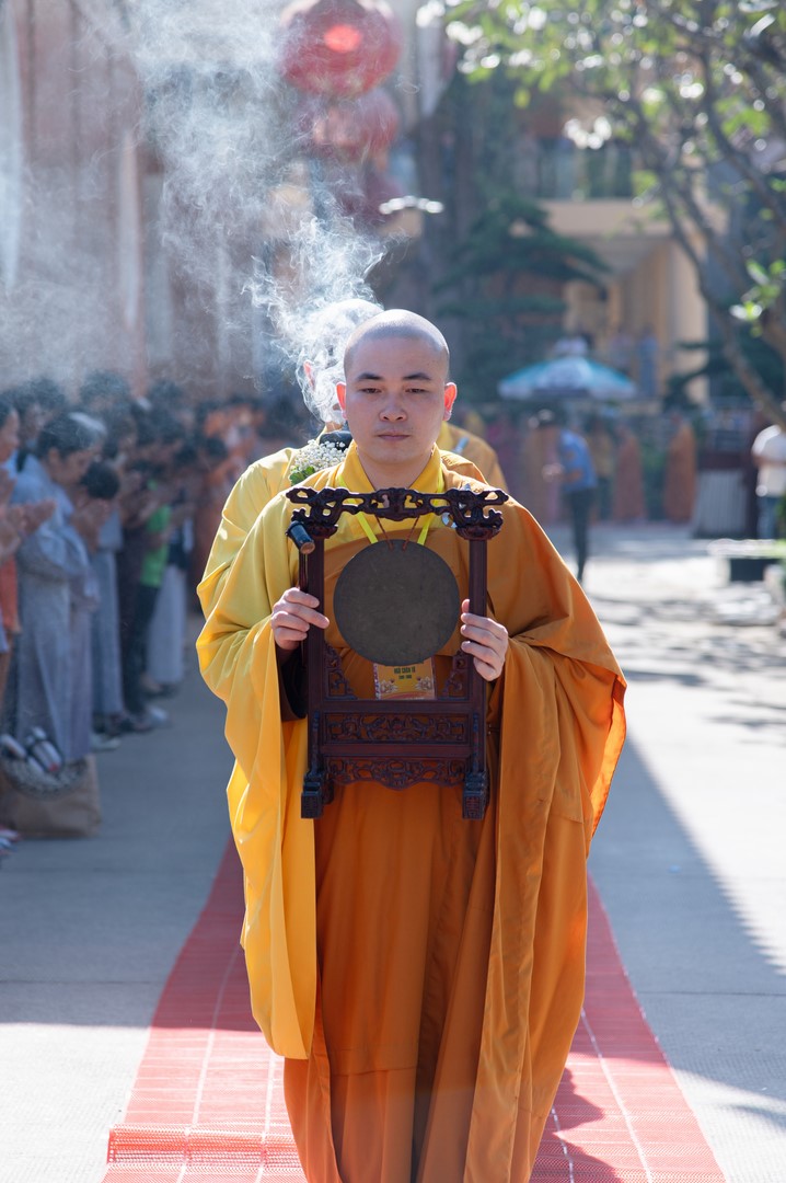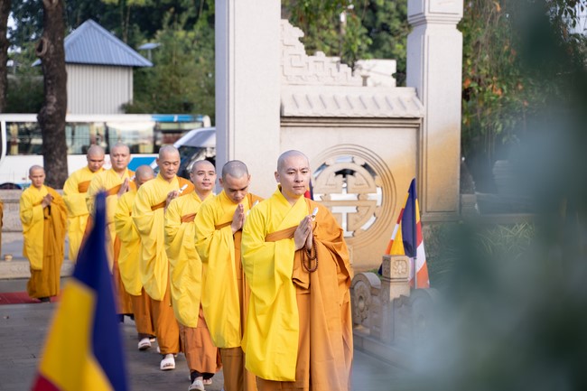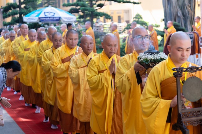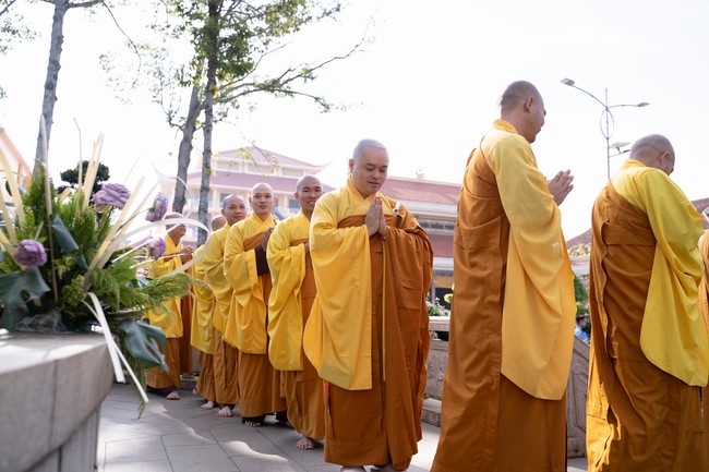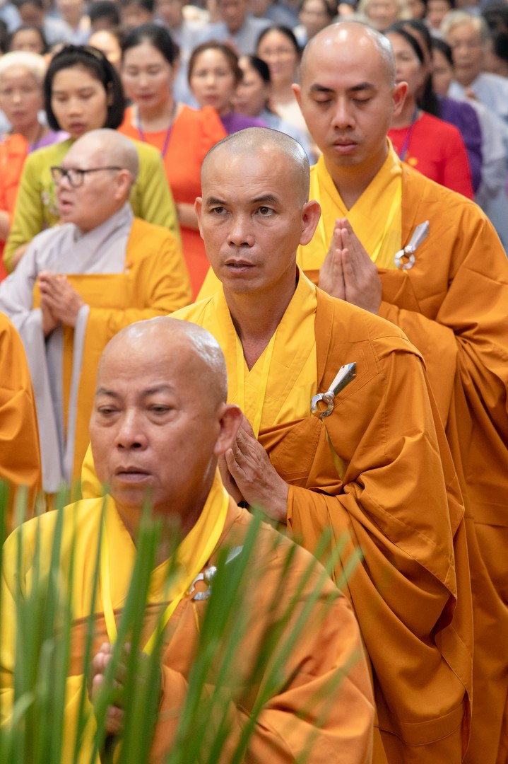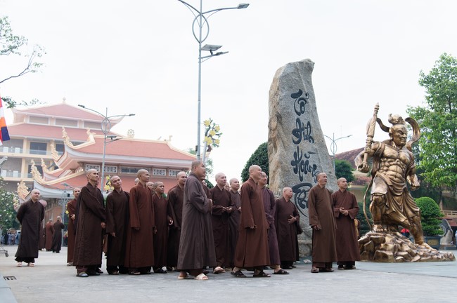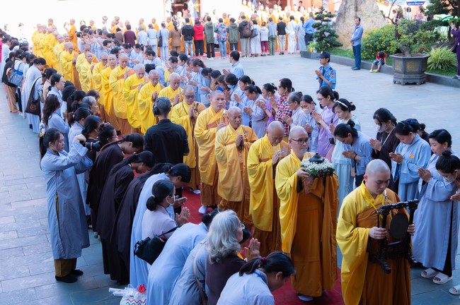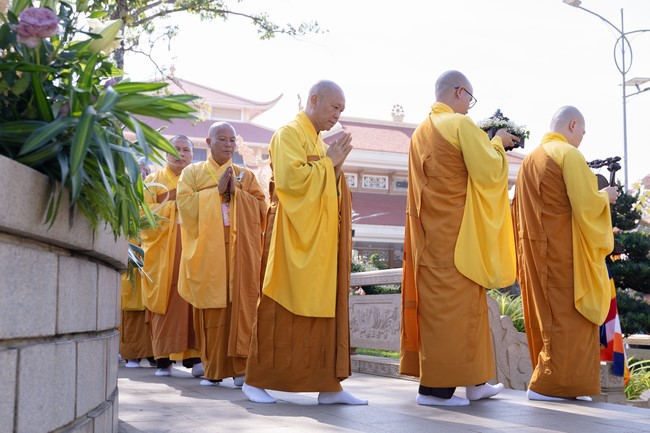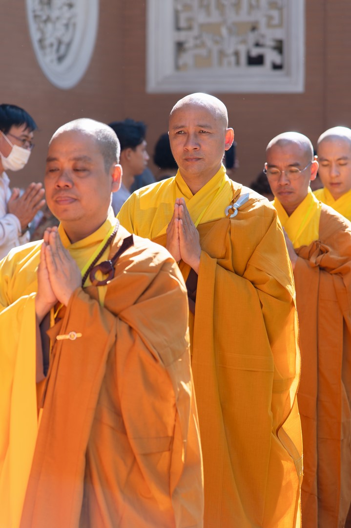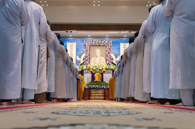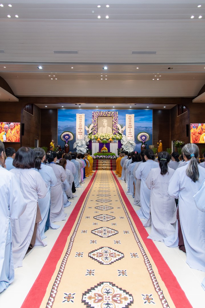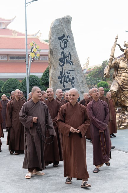 Vào lúc 08h45, đại chúng đồng thành kính cung thỉnh chư Tôn đức kinh hành, nhiễu quanh Tháp tổ, sau đó hướng về Pháp đường 1, tòa nhà Pháp Luân cử hành nghi thức lễ tưởng niệm.