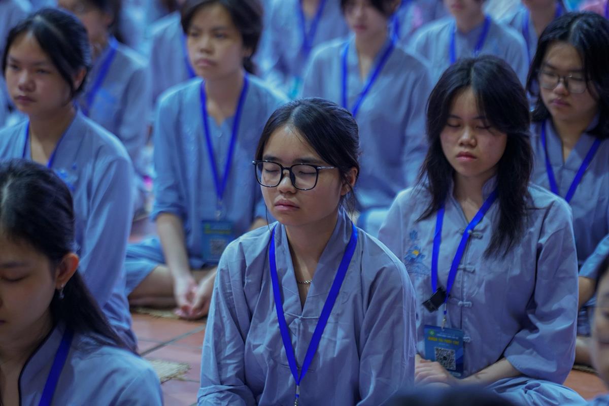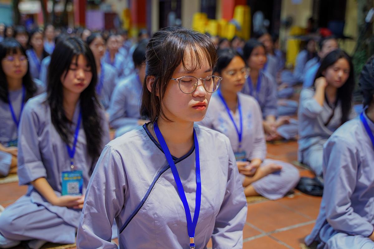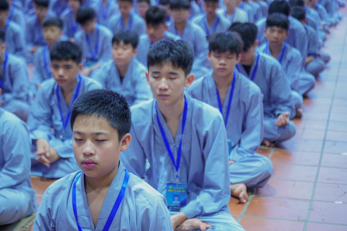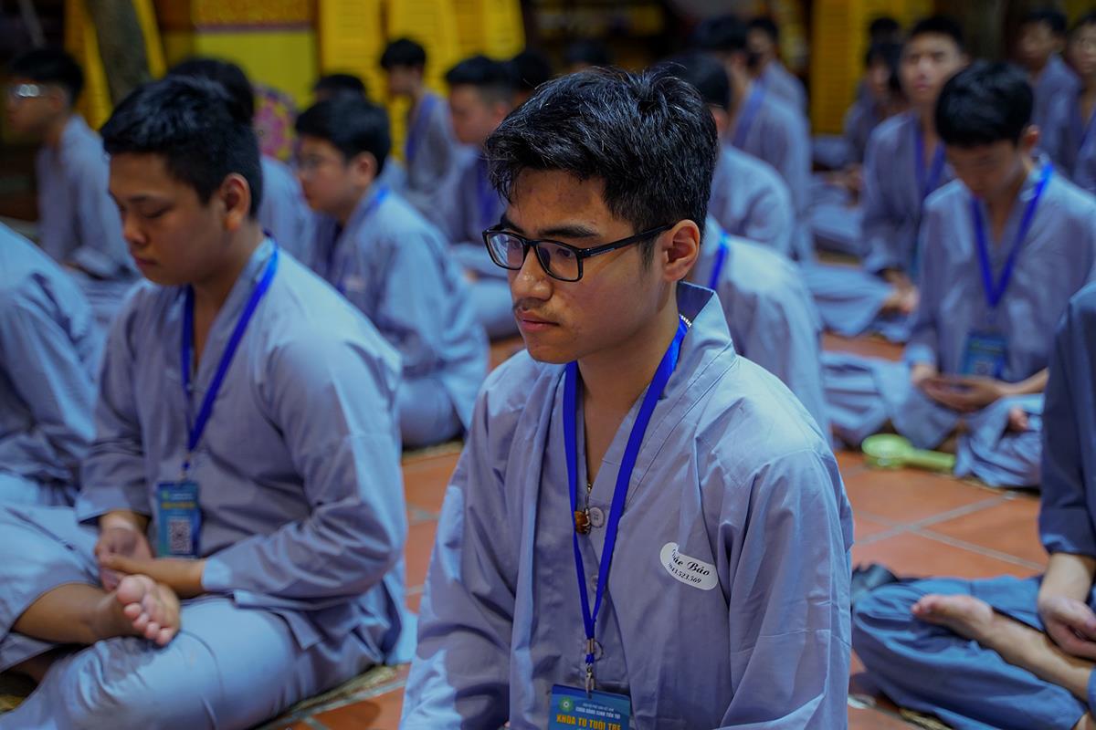 Vào lúc 5h00 sáng, tiếng chuông chùa ngân vang cũng là lúc các bạn khóa sinh bắt đầu một ngày mới tại khóa tu. Đây là ngày thứ 2 các bạn phải dậy sớm nên nề nếp sinh hoạt dần vào khuôn khổ. Các bạn đã được quý thầy hướng dẫn ngồi thiền, học cách điều hòa hơi thở để biết cân bằng cảm xúc trong cuộc sống.