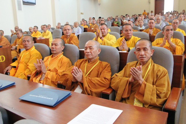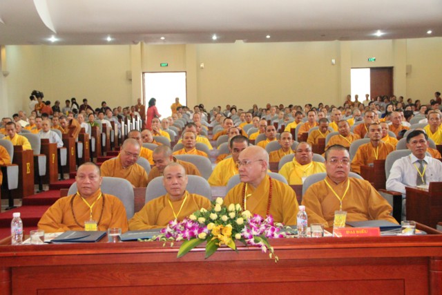 Đại hội đã nhất tâm lắng nghe lời đạo từ của Hòa thượng Thích Thanh Nhiễu thay mặt Ban thường trực HĐTS GHPGVN.